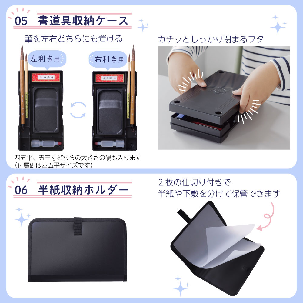 太筆、細筆、固形墨、墨液(180mL)、軽量両面硯(表面:硯、裏面:墨池)、ラバーツイン文鎮(185g)、下敷(4マス・6マス両面罫線入り)、半紙収納ホルダー、筆巻(マジックバンドタイプ)、スポイト式水差し、書道具収納ケース(左右両用・筆置き兼用)、筆の説明書、なまえシール、ショルダーベルト