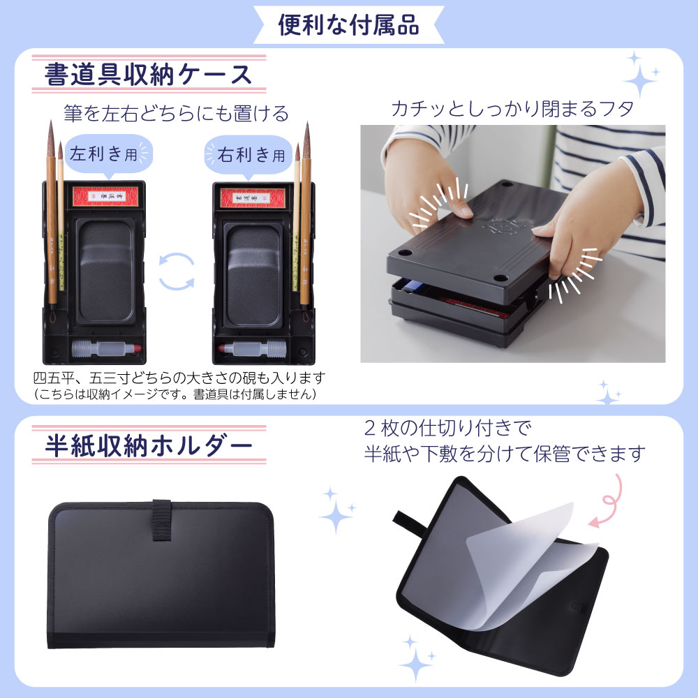 【付属品】半紙収納ホルダー、書道具収納ケース(左右両用・筆置き兼用)、ショルダーベルト