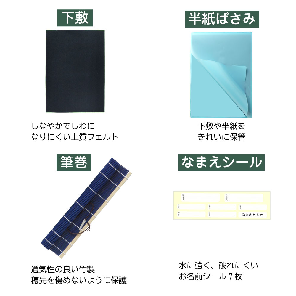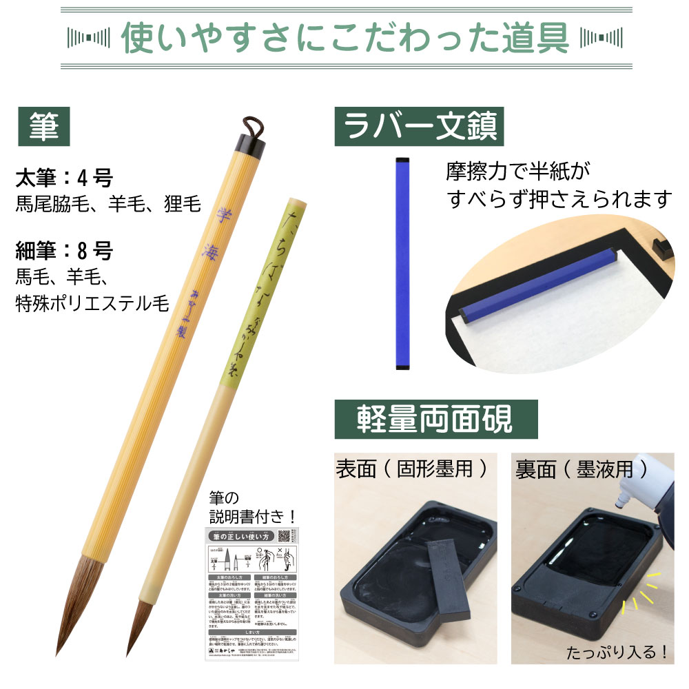 太筆、細筆、固形墨、墨液(180mL)、軽量両面硯(表面:硯、裏面:墨池)、ラバー文鎮(185g)、下敷、半紙ばさみ、筆巻、スポイト式水差し、書道具収納ケース(左右両用・筆置き兼用)、筆の説明書、ショルダーベルト(縫い付け)
